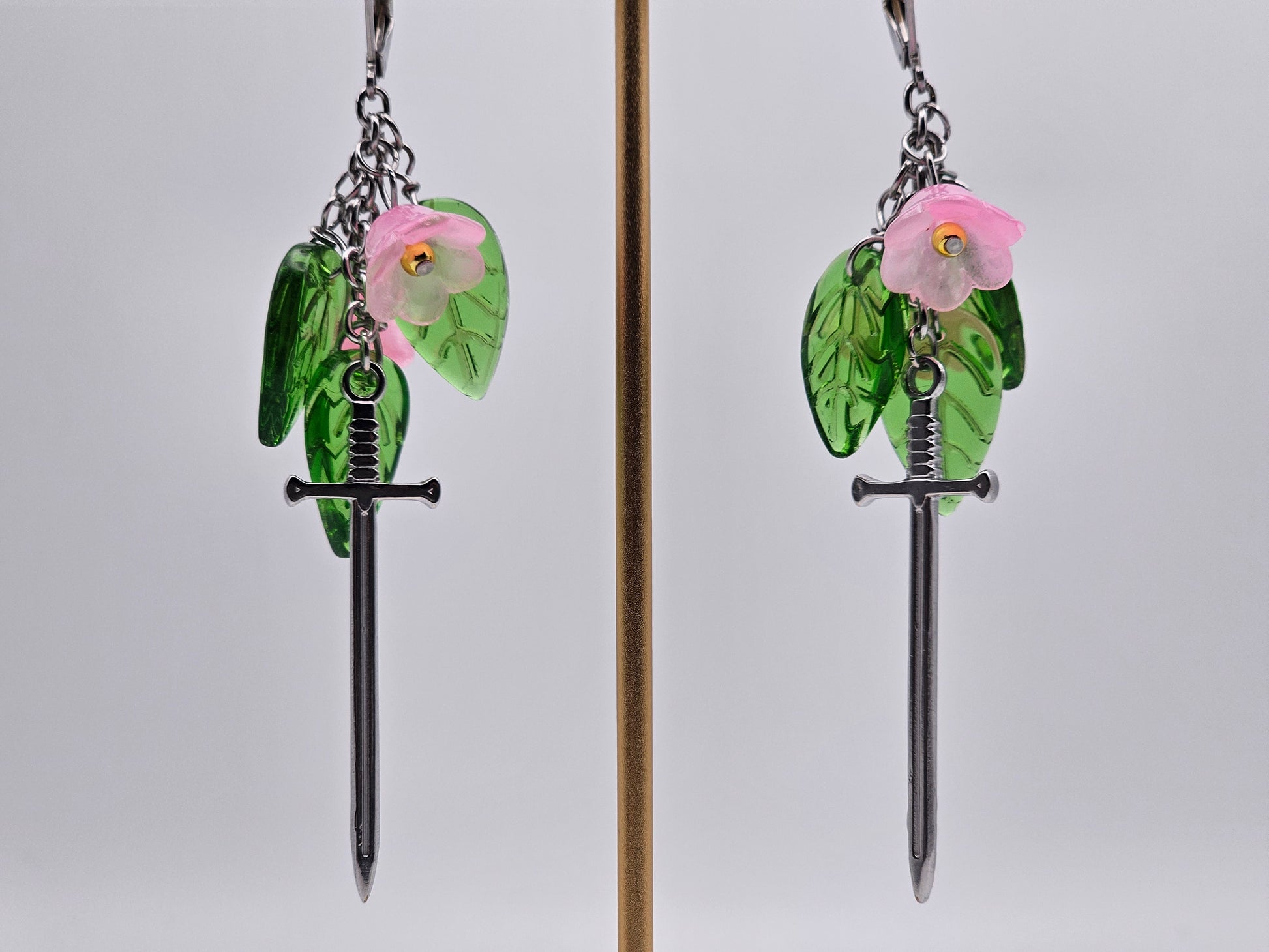 Stainless steel chains, eye pins, jump rings, and sword charms; glass leaf charms and flower beads; gold-filled beads