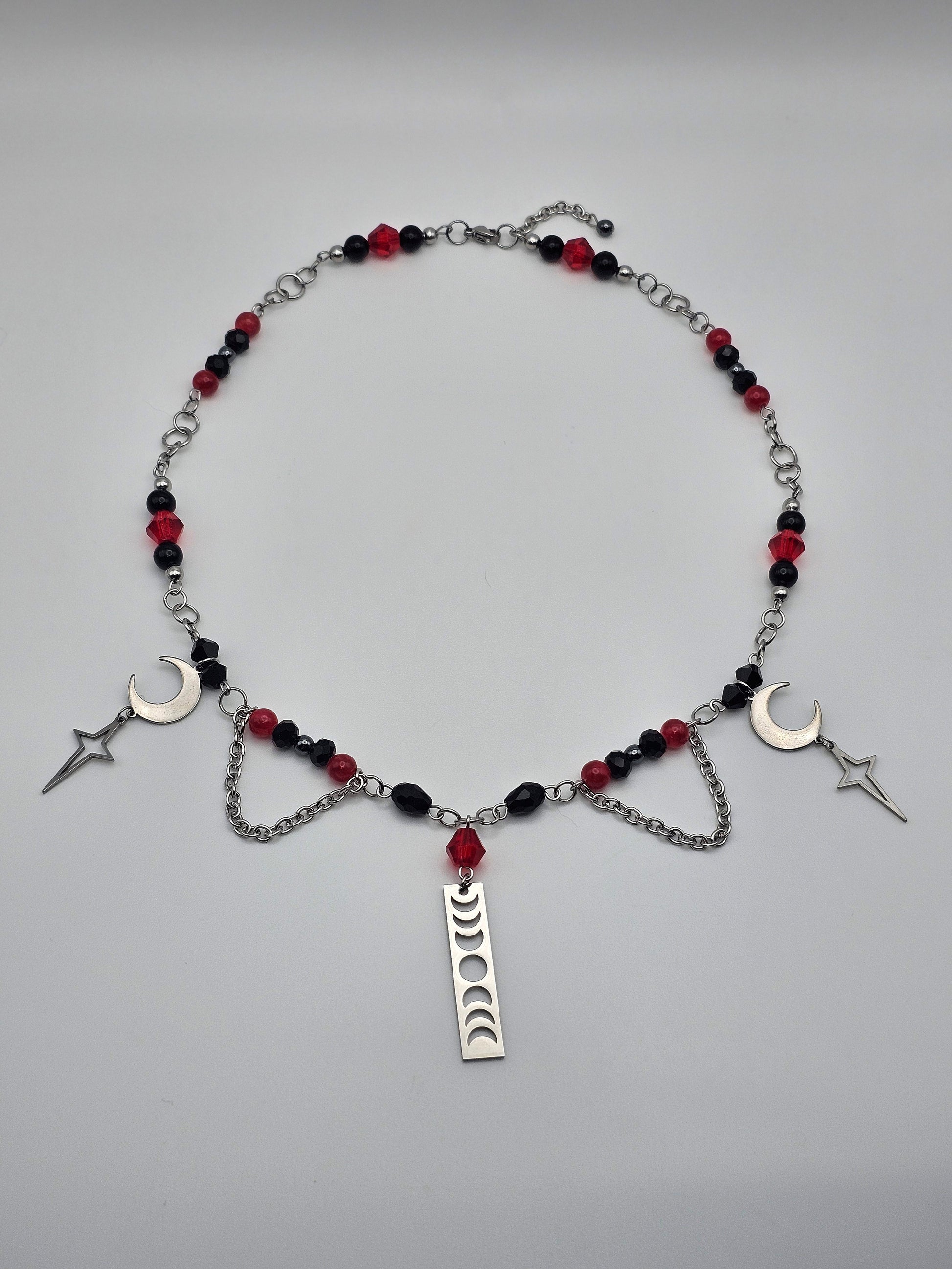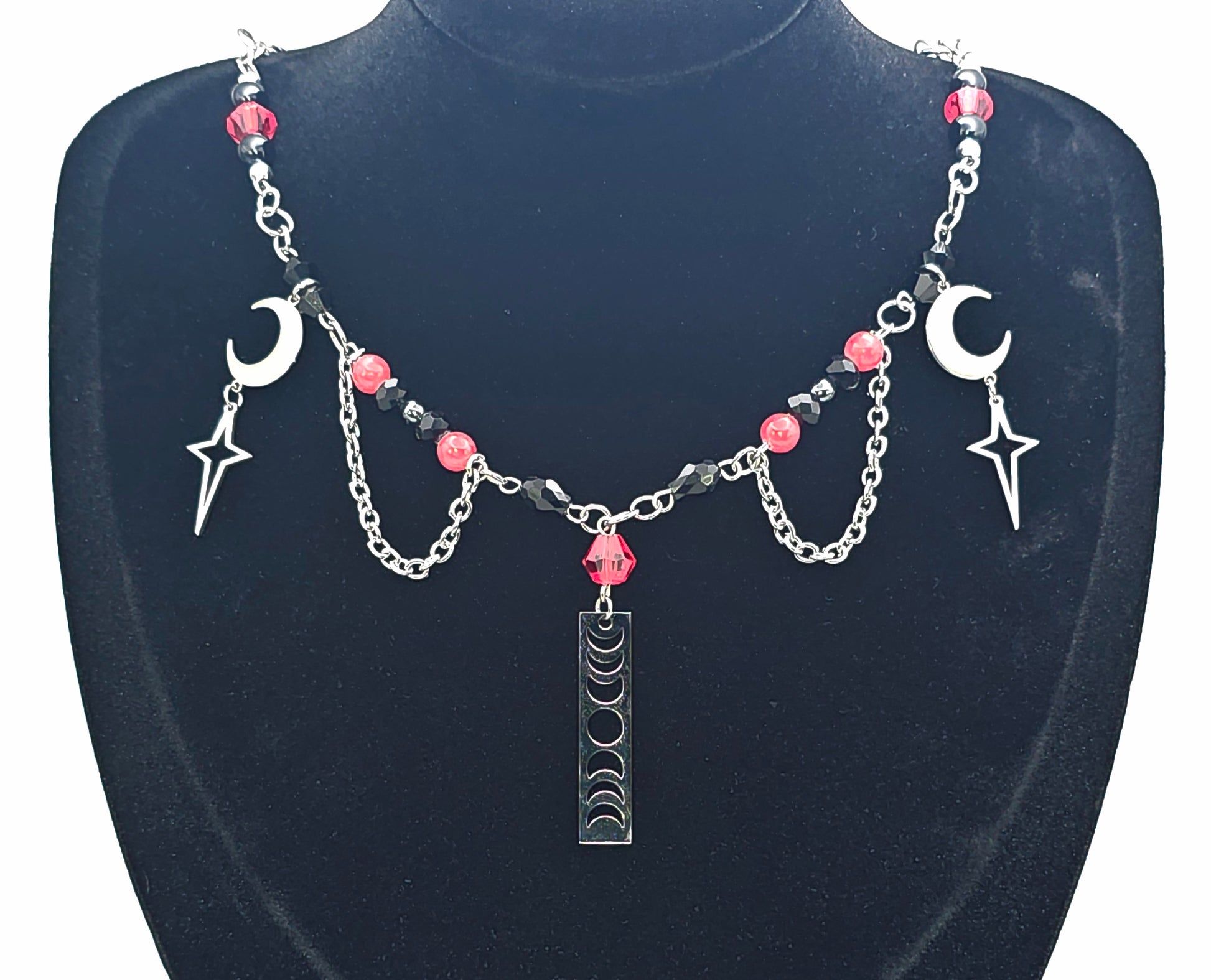 Stainless steel eye pins, jump rings, clasp, chain, spacer beads, moon phase charm, crescent moon charms, and star charms; glass beads; and natural onyx and hematite beads.