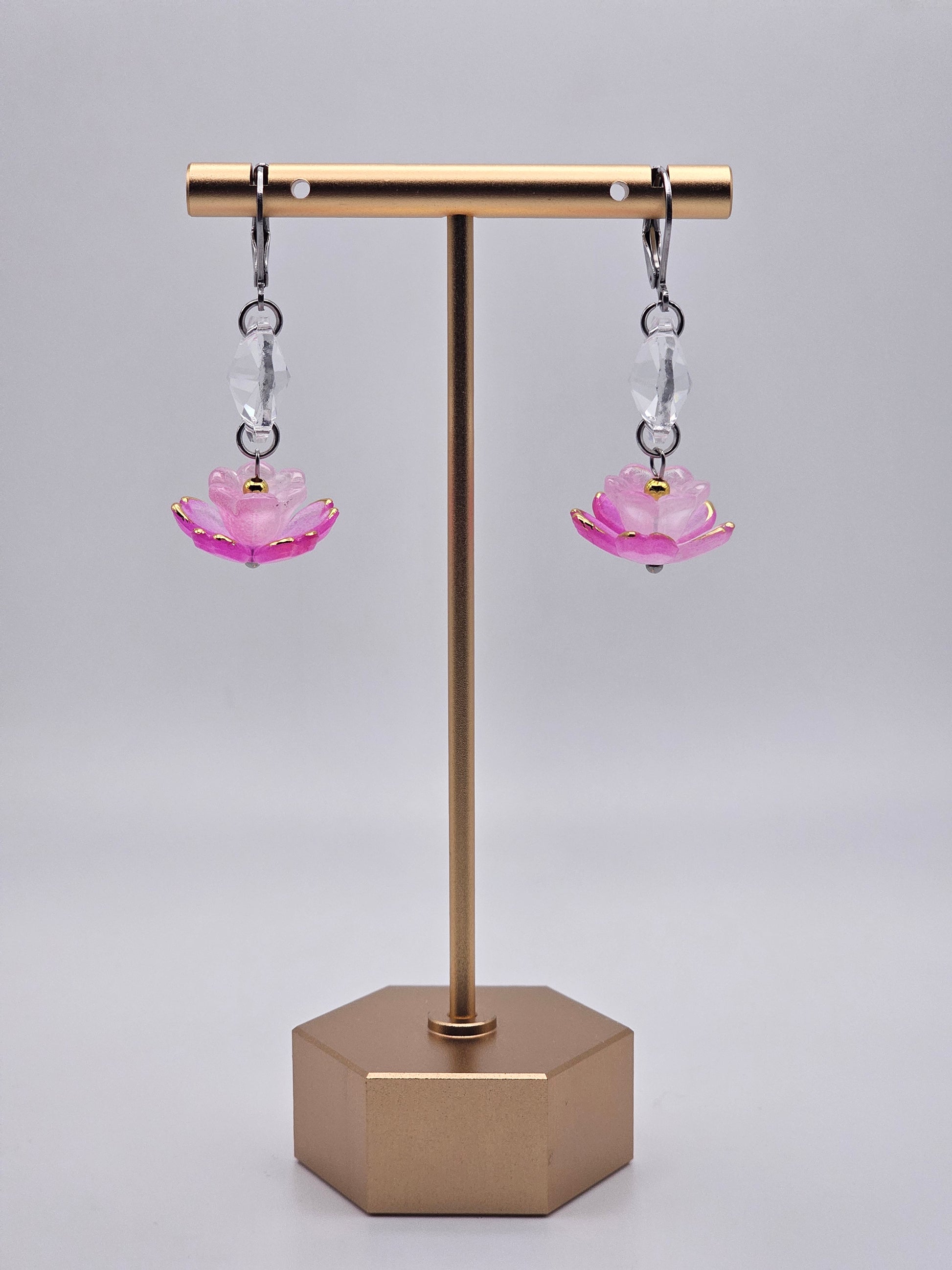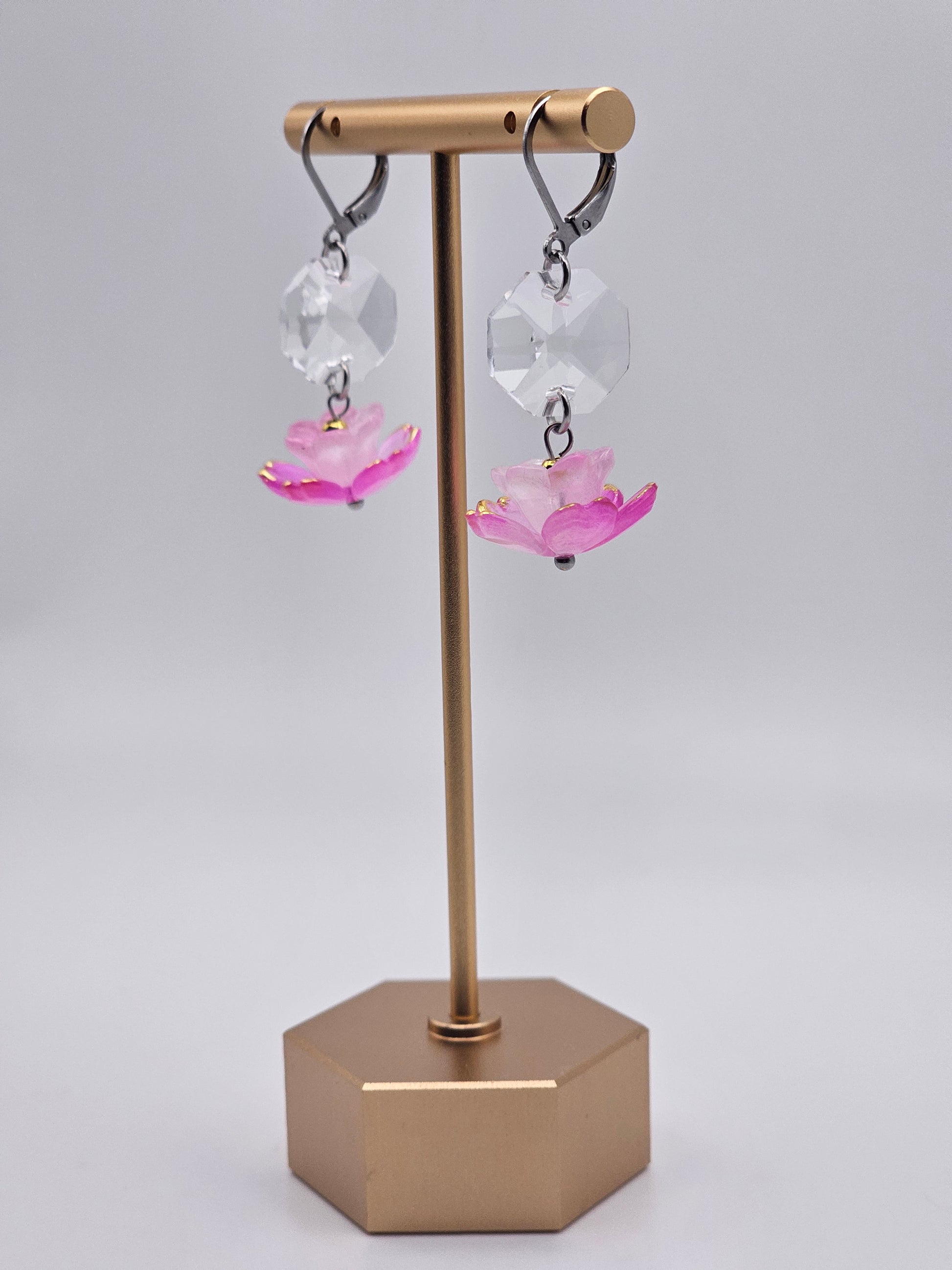 Stainless steel hypoallergenic nickel-free leverback hooks, stainless steel eye pins and jump rings, glass prism beads, metal gold filled beads, glass flower beads, and resin flower charms.