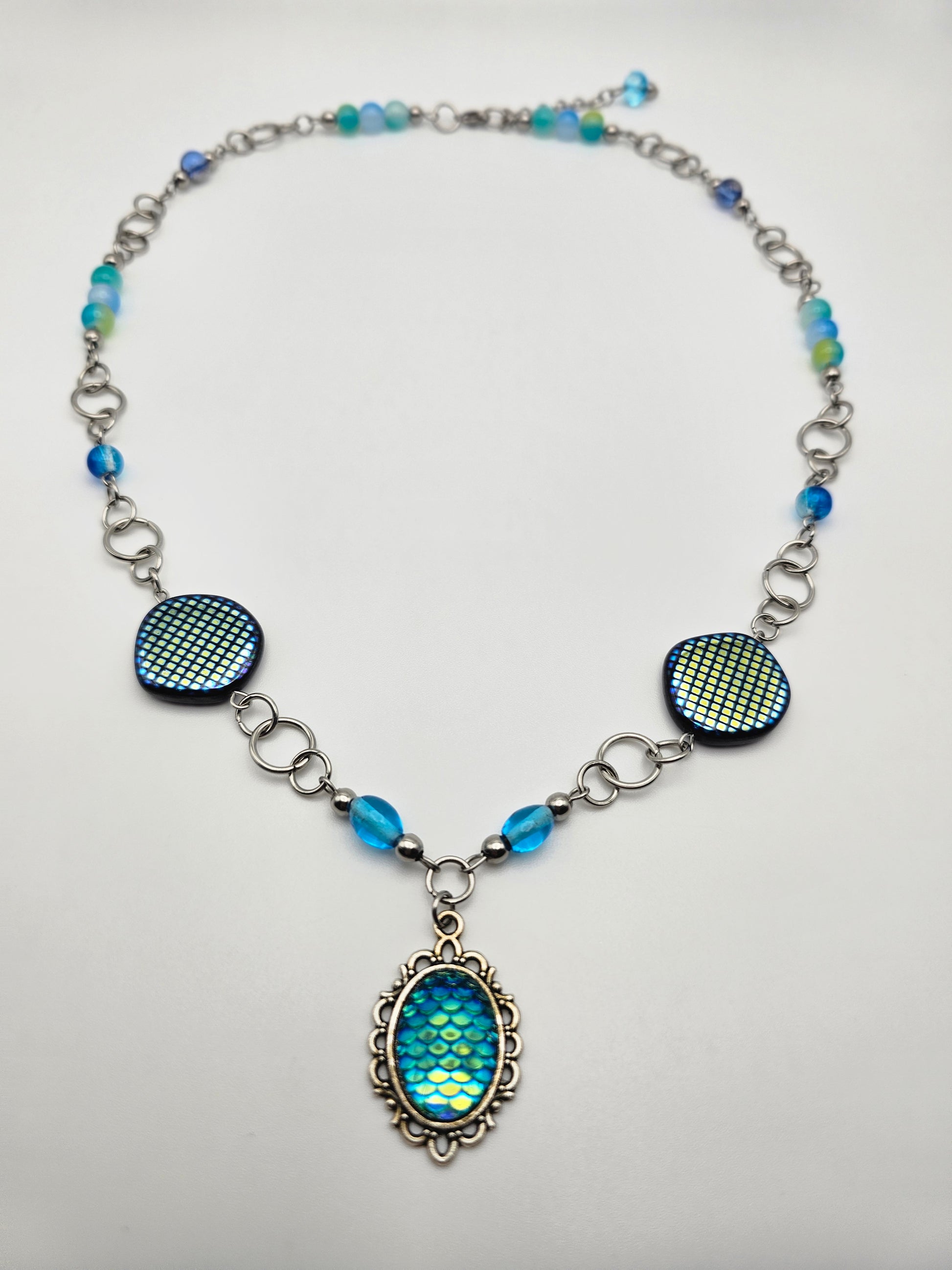 Stainless steel eye pins, jump rings, spacer beads, chain, and clasp; glass beads, electroplated glass scale beads; glass and metal alloy mermaid scale pendant