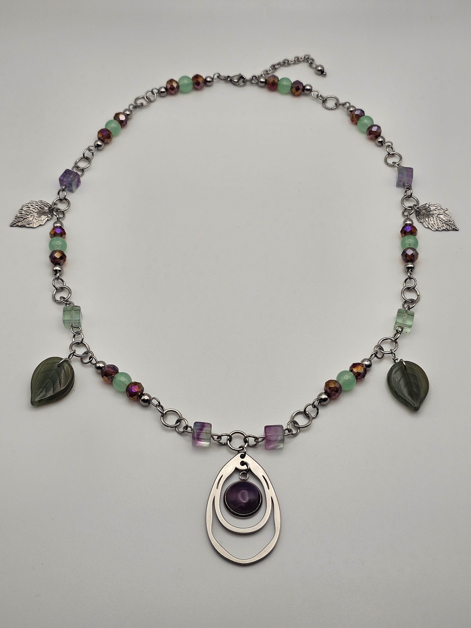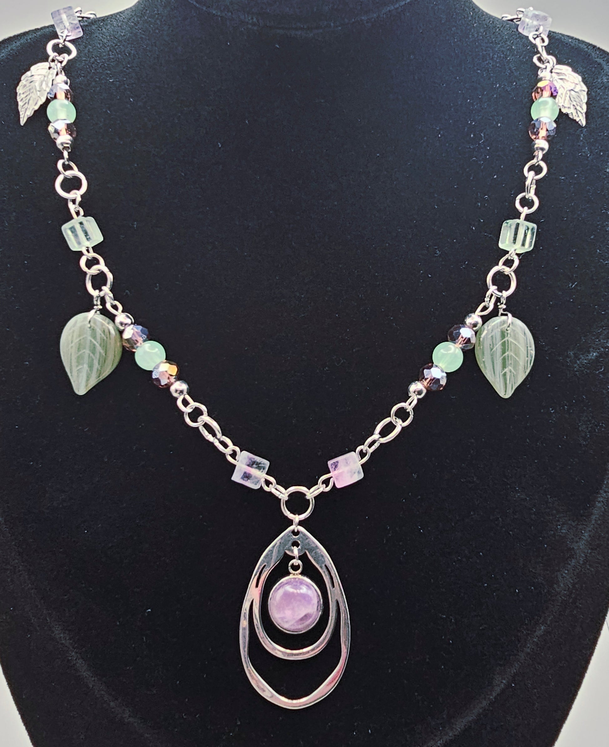 Stainless steel eye pins, jump rings, chain, clasp, spacer beads, leaf charms, teardrop pendant charm, and cabochon setting charm; glass beads and leaf charms; tourmaline beads; and amethyst cabochon.