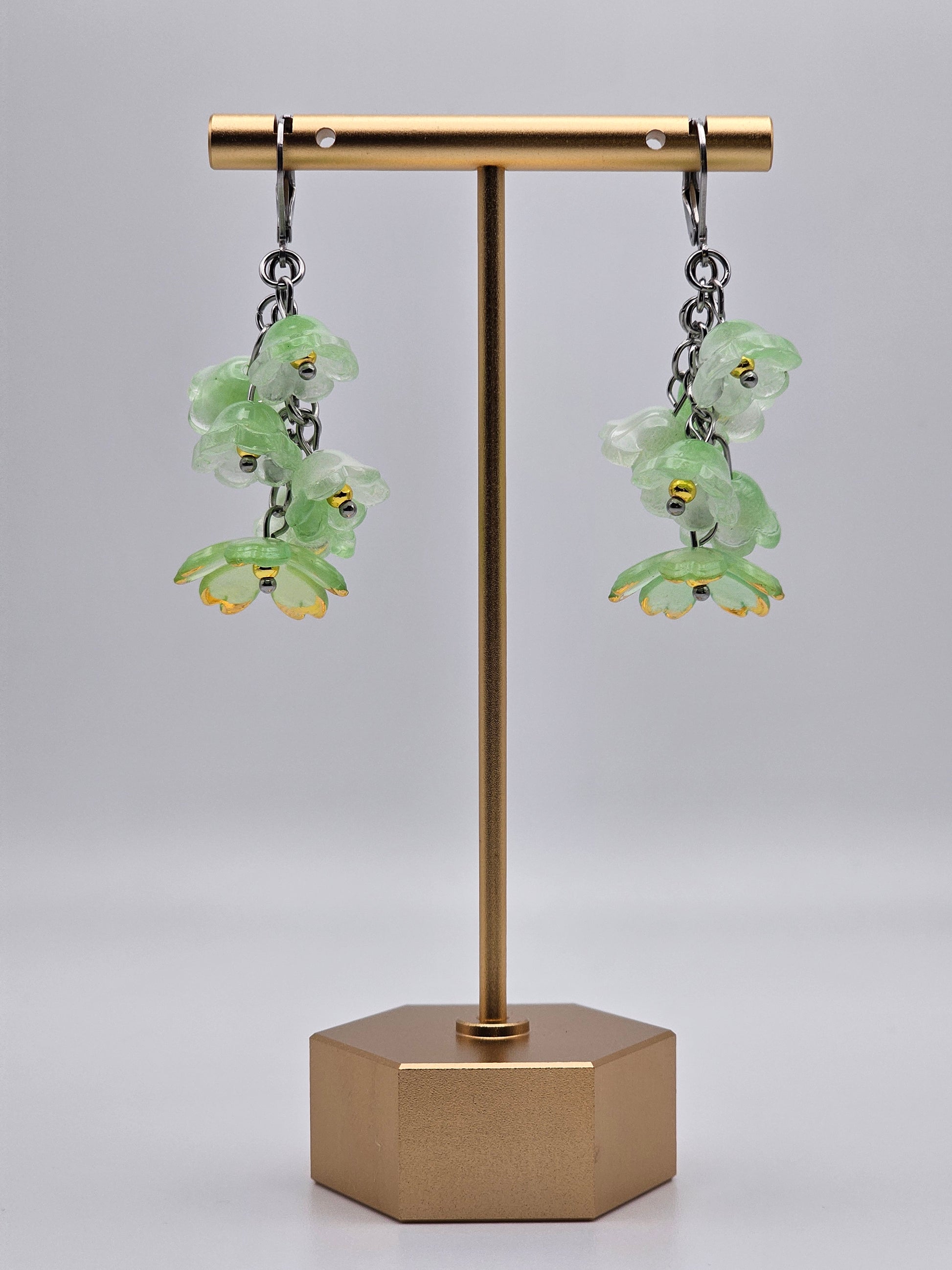 Stainless steel hypoallergenic nickel-free leverback hooks; stainless steel chains, jump rings, and eye pins; resin flower beads; glass flower beads; gold-filled metal beads