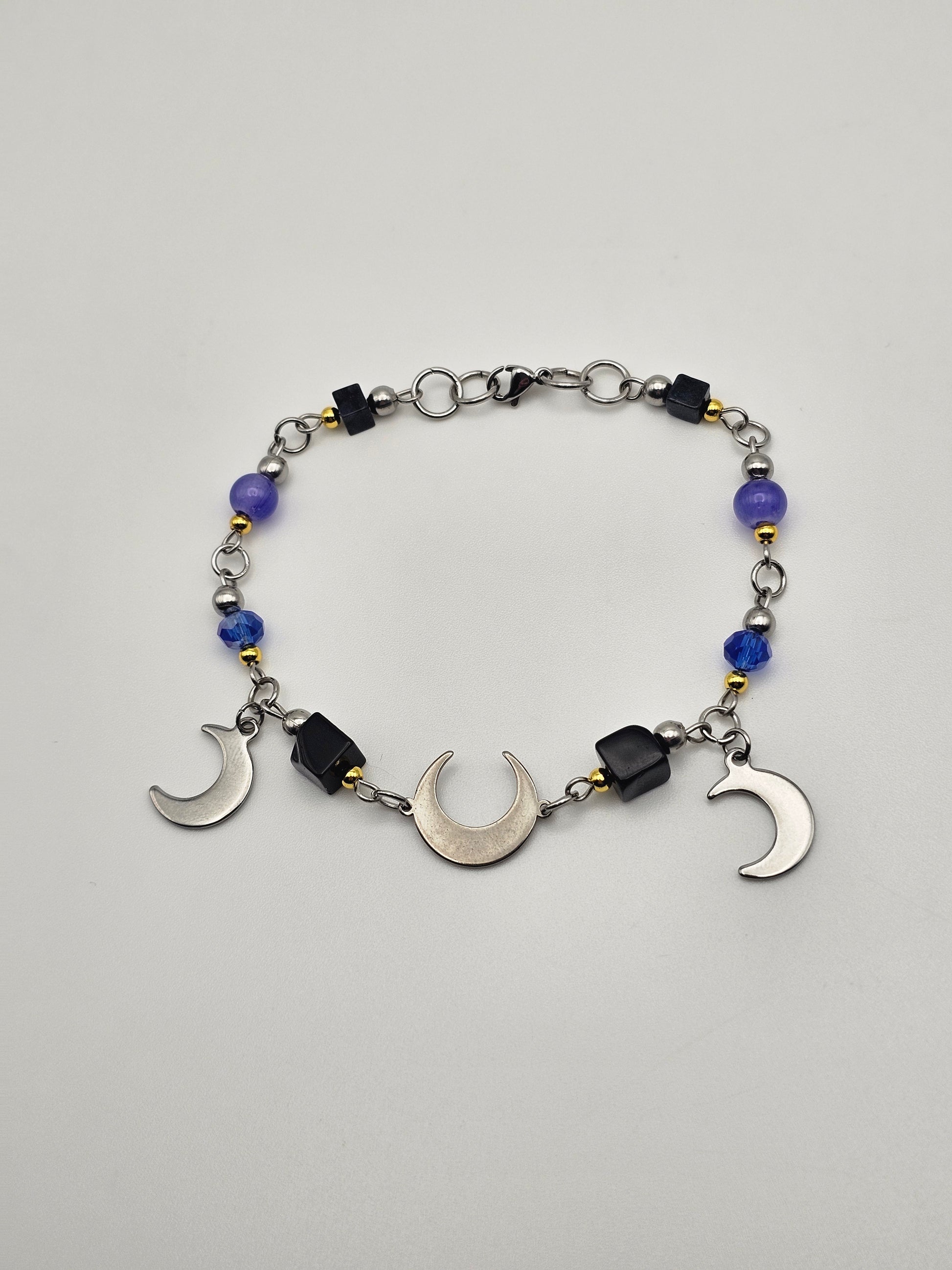 Stainless steel eye pins, jump rings, clasp, jumper beads, and moon charms; gold-filled beads; glass beads; obsidian beads; lapis lazuli beads