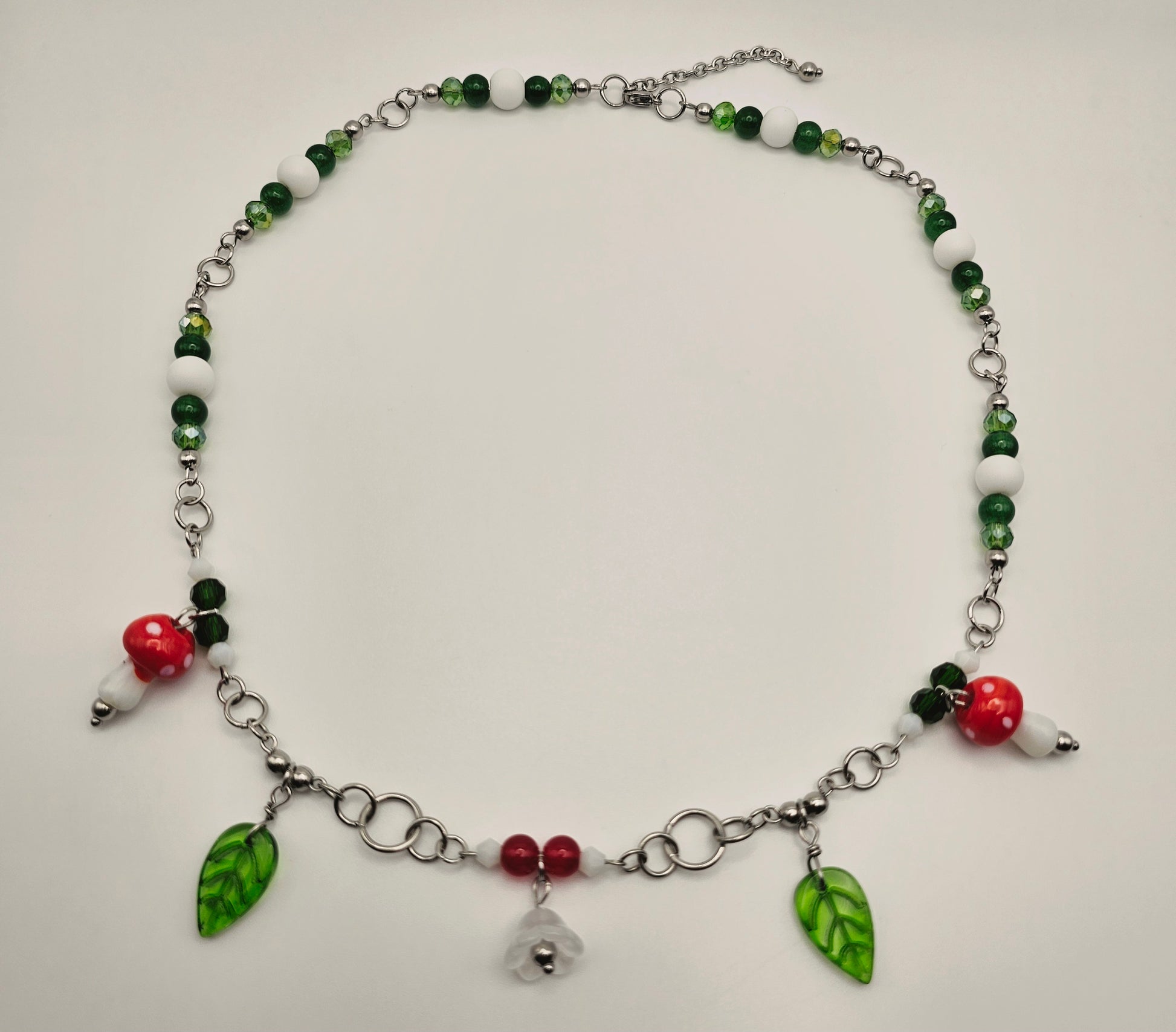 Stainless steel eye pins, jump rings, clasp, and spacer beads; glass beads, leaf charms, and flower bead; and 2 handmade lampwork glass mushroom charms